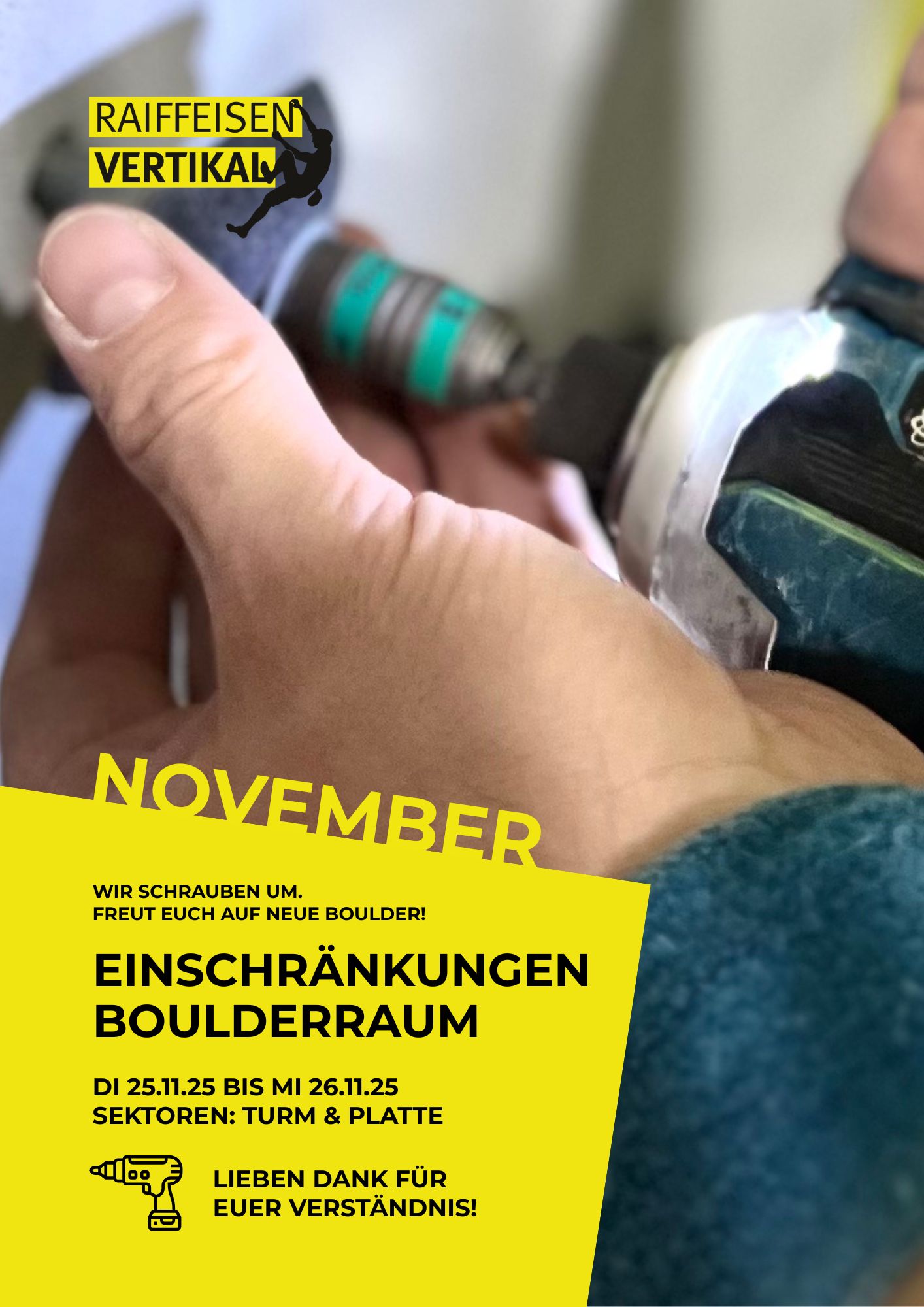 🧗♂️ Achtung Boulderfans! 🧗♀️ Am Dienstag, 25.11.2025 gibt’s im Boulderraum Einschränkungen 👉 In den Sektoren Platte und Turm wird voraussi...
